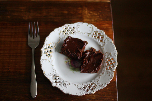 3. Freeze the loaf pan for 30 minutes to an hour. Remove parchment from loaf pan, lifting the brownies out in one big piece. Slice and serve. Note the brownies will be slightly crumbly, so they are best eaten with a spoon or fork.